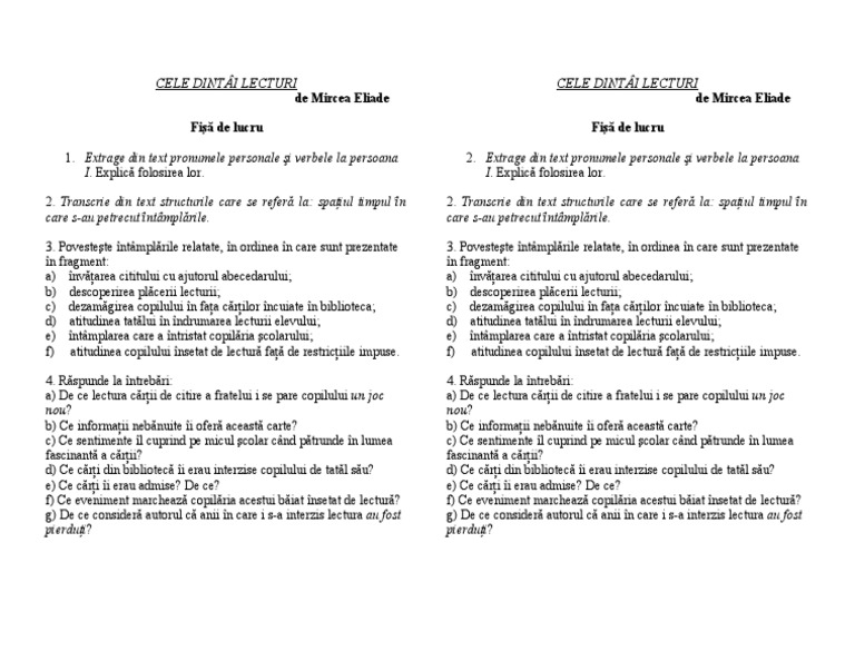 Care Sunt Personajele Din Lectura Cele Dintai Lecturi De Mircea Eliade Dau Coroana Cat De Brainly Ro