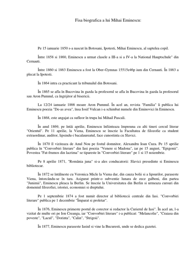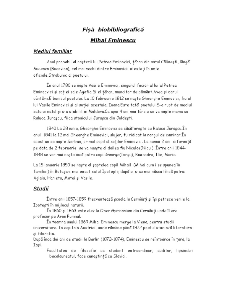 Fisa Biobibliografica A Lui Mihai Eminescu