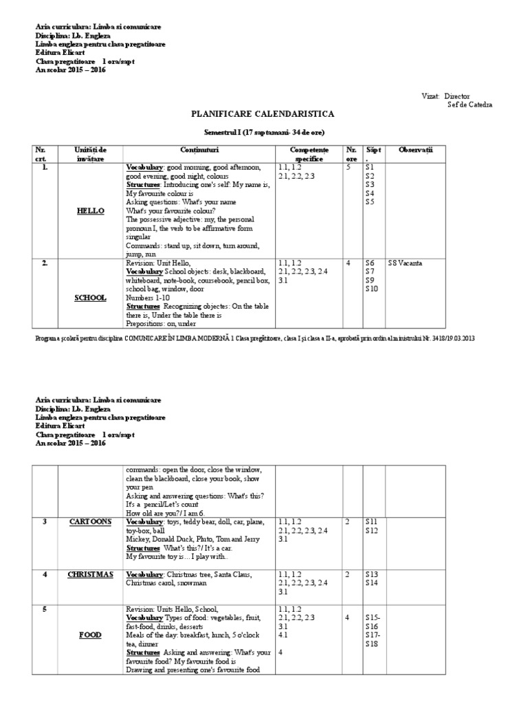 Planificare Clasa Pregatitoare Editura Elicart Foods