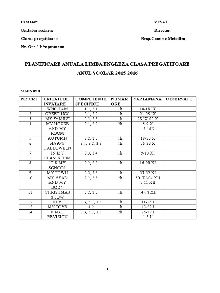 Documentele Profesorului Pentru Clasa Pregatitoare 2015 2016