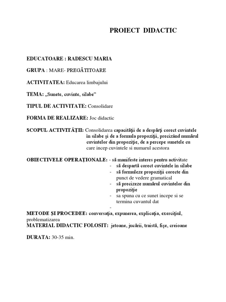 Proiect didactic educarea limbajului joc didactic. Joc didactic jocul silabelor evaluare continua. Subiectul activitatii este realizat pe centre de interes. Un joc didactic complex la dlc pentru nivel ii care abordează atât recunoașterea sunetelor cât și despărțirea în silabe recunoașterea unor litere formarea de propoziții și reprezentarea grafică a unor propoziții. Formarea deprinderii de a folosi corect dativul.