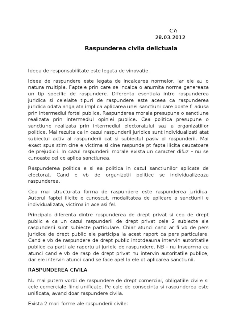 Repararea prejudiciului in cazul raspunderii civile delictuale. Dispoziţiile noului cod civil care reglementează repararea prejudiciului în cadrul răspunderii delictuale îşi au sediul într o secţiune specială art. în cuprinsul acestor reglementări sunt obiectivate în bună parte soluţiile care au fost statuate în jurisprudenţa noastră şi în doctrina de specialitate. 2 dreptul la reparație se naște din ziua cauzării prejudiciului chiar dacă acest drept nu poate fi valorificat imediat. Orice prejudiciu dă drept reparaţie.