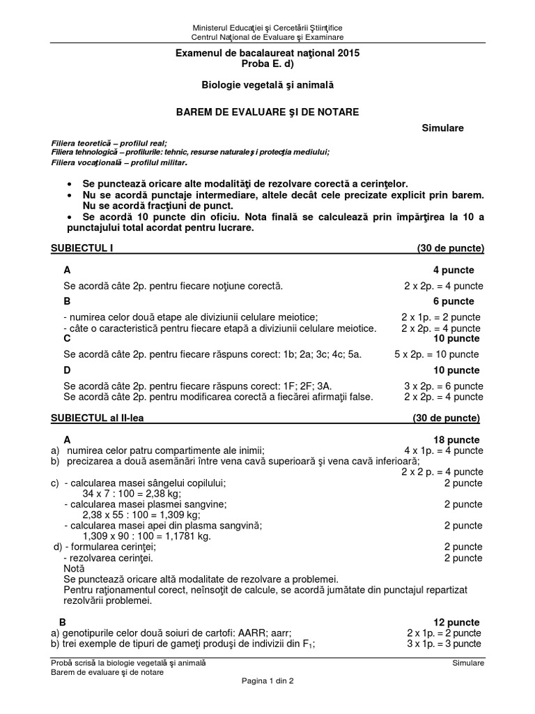 Simulare Bac 2015 Biologie Vegetală și Animală Barem De Corectare