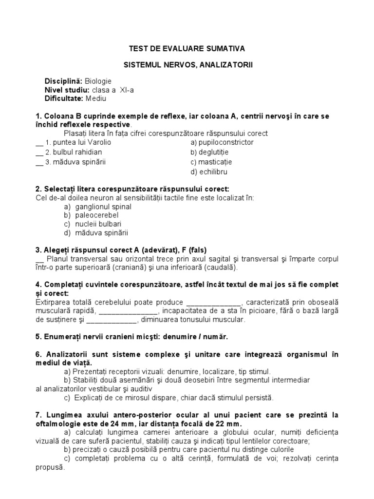 Test Biologie Clasa Xi Sistemul Nervos